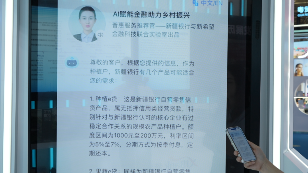 展会现场,新疆银行携手世界500强新希望集团旗下的新希望金融科技,共同展示了基于大模型、多模态反欺诈等科技创新的最新成果——“AI普惠服务推荐官”和“天镜AI视频面签解决方案”一度成为焦点。这些前沿产品不仅体现了人工智能与金融服务的深度融合,更是新疆银行践行普惠金融、服务地方经济、提升客户体验的生动实践。