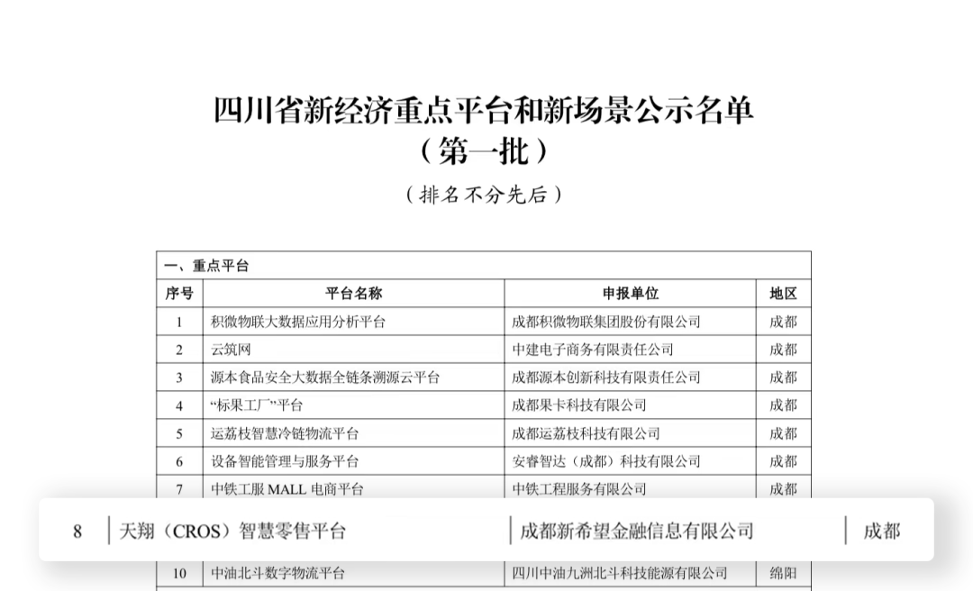 日前,四川省经济和信息化厅在官网发布了《关于四川省新经济重点平台和新场景名单(第一批)的公示》。凭借领先的人工智能技术、创新的业务模式、突出的市场表现和可持续发展的商业愿景,新希望金融科技打造的“天翔CROS智慧零售平台”,成为10个四川省首批新经济重点平台之一。